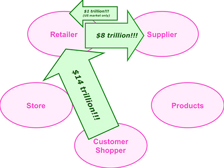 Of the $14 trillion shoppers spend over the year, the retailer sends $8 trillion on to their suppliers, spending the rest on building and operating stores. Notice that in the U.S. market alone, the suppliers return $1 trillion back to the retailers in the form of promotional fees, trade allowances, etc., which, given the very narrow net margins on sales, becomes the dominant source of profits for very many retailers!