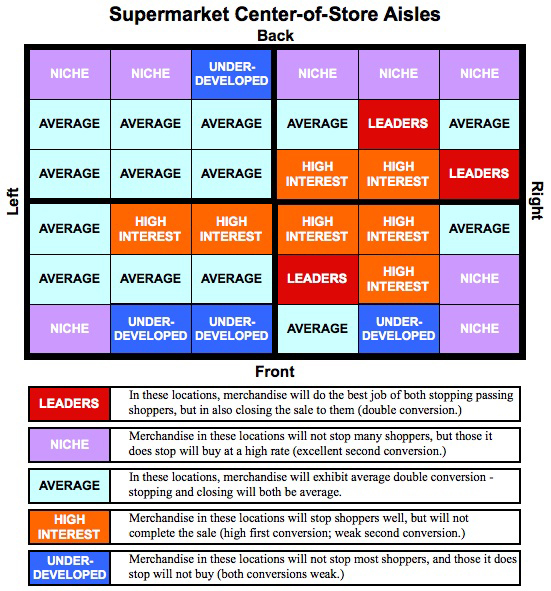 Notice in this Center-of-Store Aisle study, that shopping behavior is associated with locations, not with the categories at those locations. In other words, it is the location that induces the behavior, not the products on the shelf. This is further supported by the fact that across more than a dozen stores, tracking hundreds of thousands of shopping trips across the full store - not just the center-of-store - fourteen different categories appear in at least one of the stores as a leader category. One of those, produce, was a leader in every single store. However, four of the categories were leaders in only a single store: candy, crackers, ethnic foods and pet foods. All four of these have significant presence in the center-of-store, and once you realize that only three of the thirty six center-of-store locations consistently produce leader results, it's not hard to understand how a lot more categories than perimeter categories can be leaders. Other than those already mentioned, canned vegetables, frozen dinners and salty snacks also showed up as leaders for the full store. This means there are locations (indicated in the diagram,) that are as valuable, if not more valuable, than many end-caps. Fascinating potential here for managing sales! (Note that all three of these leader areas are in the right half of the center of store, suggesting that the U-turn discussed in Tell 'em Where to Go; Tell 'em Which to Buy! may be driving this "leader" behavior.)