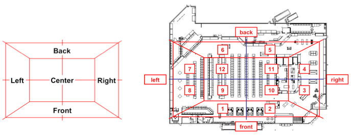 The simplest way to express geography in the store is to describe it as five general areas: front, back, left, right and center. This is the foundation of a sector scheme for classifying store geography. The most practical level of sectors is usually twelve (but could be 48, for greater resolution of detail, or any other number, suitable for the specific task at hand):